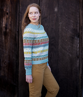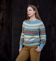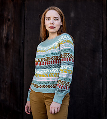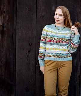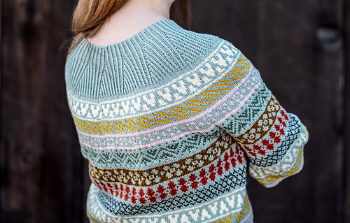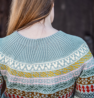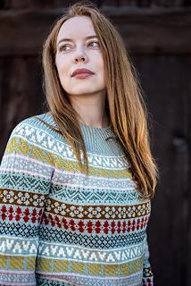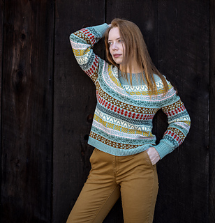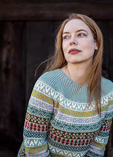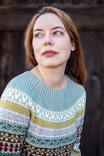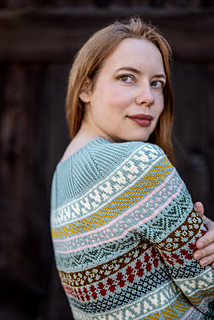 Eostre is a seamless, top-down sweater worked in the round, inspired by the quiet return of light and color in early spring. A radiant circular yoke unfolds in delicate, rhythmic colorwork bands, echoing folk motifs and the soft geometry of Fair Isle traditions. The fabric flows from a gently sculpted yoke into a relaxed body and long sleeves, creating a silhouette that feels both timeless and wearable. This pattern offers an immersive, meditative knitting experience, with charts and written instructions guiding you through a tapestry of shifting hues.
