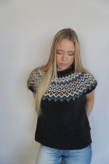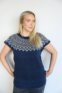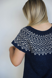 The body is worked in a solid color, while the yoke is knitted with a stranded pattern.