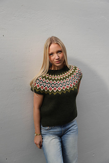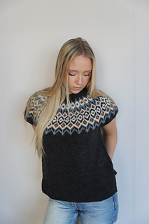 Erla vest is knitted in the round, using stockinette stitch and stranded colorwork.