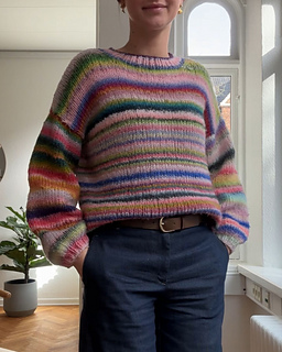 Evergreen Sweater strikkes nedefra og op i en simpel konstruktion. Opskriften er nem at følge og skrevet i et begyndervenligt sprog. Først strikkes kroppen rundt på rundpind til under ærmegabet, som formes ved at strikke forstykket og rygstykket for sig. Både på forstykke og bagstykke lukkes masker af til halsåbning, hvorefter hver skulder strikkes hver for sig. Til sidst sys skuldermaskerne sammen med maskesting, hvorefter der samles masker op i halsåbningen til halskant og i ærmegabene til ærmer med trekvart længde. Når du strikker Evergreen Sweater i Cloud vil striberne bliver bredere på ærmerne, fordi omkredsen er mindre, end når du strikker kroppen. Striberne er også anderledes hvis du strikker frem og tilbage end rundt. Det giver dit projekt et smukt farvespil og gør det livligt.