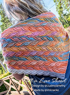 The Fall in Love Shawl is worked vertically, flat, in one piece. Repeats of the Ivy stitch pattern are structured to create a double-sided scarf textile. The Ivy stitch pattern is created using the short-row technique, standard crochet stitches (US terminology), and some special stitches. It is smoothly integrated into the triangle shape framed with ribbing edges AB and AC, using increases and decreases and the decorative edge BC.
