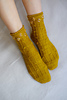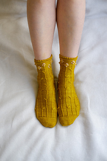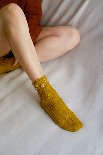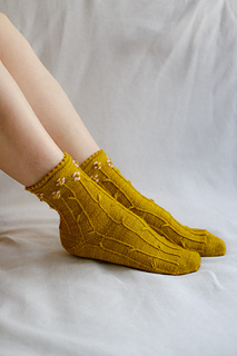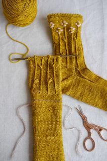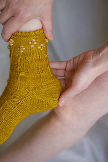‘Farmstand socks’ es un patrón para tejer un par de calcetines con relieves en forma de tallos que florecen al final. Se tejen de abajo arriba, comenzando desde la puntera hasta llegar a la caña. Incluyen una puntera ergonómica para mayor comodidad de los dedos del pie, y un talón ‘forethought’ que se teje al final del todo. Si lo deseas, puedes bordar alrededor de los bodoques para crear flores en contraste.