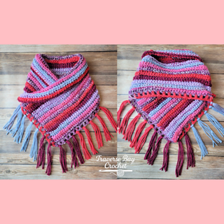 Stay warm and stylish with this easy-to-make V-front neck warmer! Featuring a textured half double crochet slip stitch and optional fringe, this neck warmer measures approximately 10” wide (not including fringe) and 28” long. Perfect for layering over your favorite winter outfits, it’s a quick project that uses just one skein of medium weight yarn.