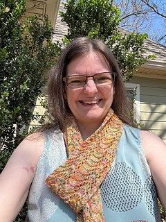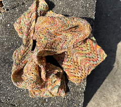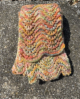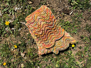 I used a partial skein of what I think was Knit Picks Swish, dyed with Easter egg dye. As knit it came out to 4 inches/10 cm wide and 6 feet, 7 inches (a little more than 2 meters) long and I used pretty much all the yarn I had (about 340 yards if my guess on what yarn it is was correct).