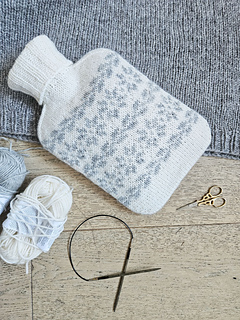 Knitting pattern for a hot water bottle cover with traditional Norwegian colorwork.