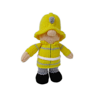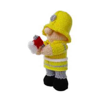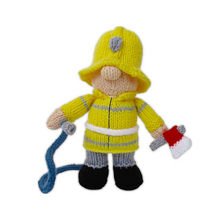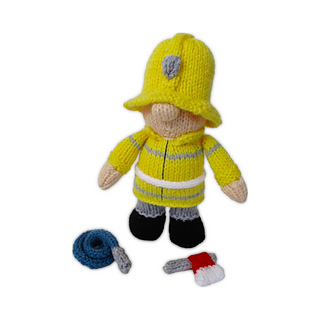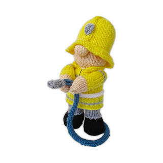 Fireman Fred is a little hero, fighting fires and rescuing cats from trees! With this pattern you can knit your own fireman, with an axe and hosepipe. This doll is worked predominantly in stockinette, and incorporates a three needle join to join the jacket to the body as you knit. Designed by Amanda Berry @fluffandfuzz, the fireman is knitted in acrylic DK yarns on single pointed needles (not in the round). The hosepipe is an i-cord tube worked on two DPNs