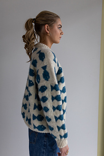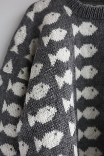 Knitting pattern for fish pattern sweater. Fishy sweater Hip Wool. The sweater is knitted from the bottom up in Hip wool. When the sleeve opening is made, the front and back pieces are divided into 2 parts which are knitted separately to the specified length. Sew or knit together over the shoulders. Sleeves are knitted from the top down - stitches are knitted up in the sleeve opening on the body.