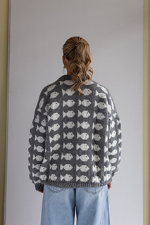 Pictured in “Coconut White” with fish in “Blue waves” size M, gray sweater “Cloudy grey” with fish in “Dancing Snowflake white” in size L