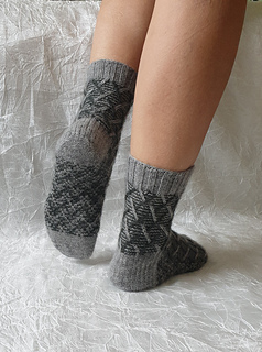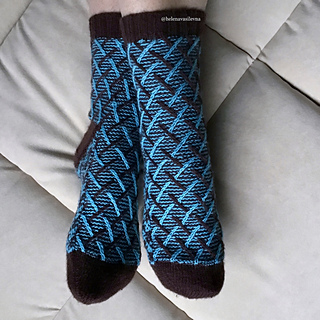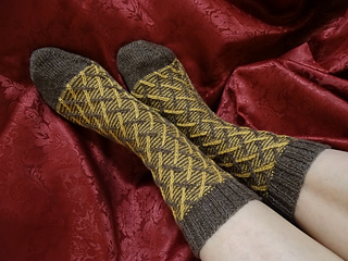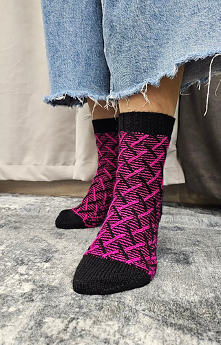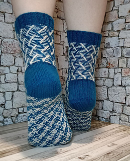 These charts are worked using slipped stitches. Unlike Fair Isle, there are no color changes during the round, no threads floating at the back of the work – or at the inside of the sock. Each round is worked completely in one color. At the end of each round, pick up the next color from underneath the color you just worked with to create a jogless striping (do not twist yarns).