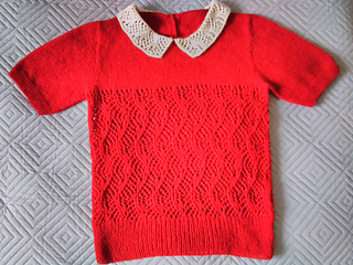 Materials required: 7 skeins of ruby-red 2-ply wool, a pair each of No. 7 and No. 10 bone needles, 6 black buttons, a small bow of black cord to trim front of belt, a few patent fasteners for the shoulder.