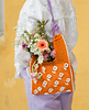 Molla-kalalanka 18-säikeinen oranssi (porkkana 45) 220 g, Liina-kalalanka 12-säikeinen luonnonvalkoinen (06) 30 g. Olkahihnaan Molla-kalalanka 18-säikeinen liila (orvokki 36) 40 g