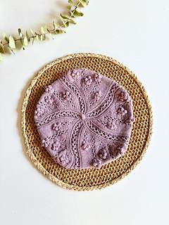 The beret is worked from the top center down to the lower ribbing, allowing you to try it on as you go if you wish to adjust the fit or if your gauge differs slightly from the pattern. It is worked entirely in the round, always on the right side.