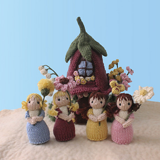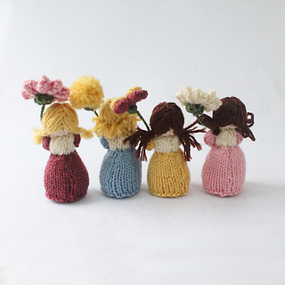 All components are knitted flat and stitched together at the end. The essential skills required are the basic knit and purl stitches; however, it’s important to take your time and be careful during the assembly process. The dolls share the same fundamental body pattern. The fairies hold flowers crafted from knitted pieces and lightweight wire.