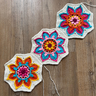 The hexagons, squares and border of this pattern are crocheted in the round.
