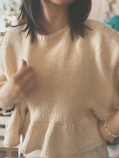 먼저 어깨 부분의 코를 잡아 앞 요크를 뜬 뒤, 앞 어깨에서 코를 주워 뒷 요크를 뜹니다. 앞뒤 요크가 완성되면 겨드랑이 아래에서 코를 추가로 잡아 앞뒤를 연결하고, 원통으로 이어서 몸통의 프릴 부분을 뜹니다.