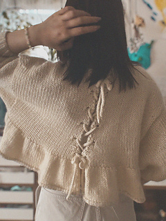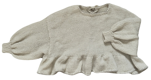 Once both yokes are complete, stitches are cast on at the underarms to join the front and back. From there, the body is worked in the round with increases to create a frilled hem.
