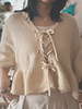 The body and sleeves are designed with plenty of volume, and the lacing detail at the back, finished with blanket stitch, adds a unique accent.