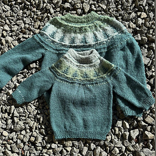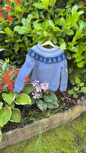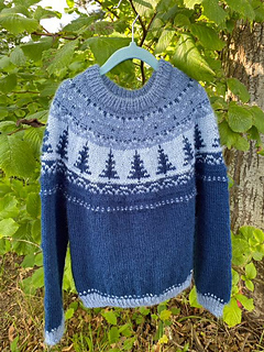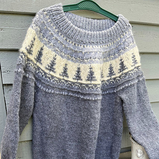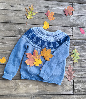 The sweater is worked from the top down. The neckline is made using an extra elastic cast on method, so it’s easier to get over the head. The pattern is worked according to a diagram and using two different colors at a time. Purl stitches are added to give the pattern texture.
