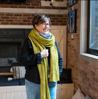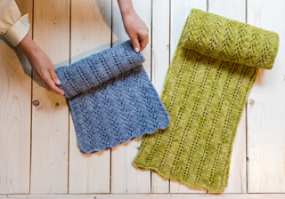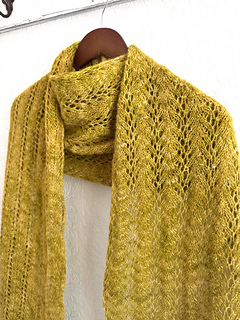 Foliage est une grande écharpe (foulard) tricotée avec une laine composée de bébé alpaga, coton Pima et mérinos. La longueur se modifie et elle est composée de deux sections tricotées avec deux motifs différents de dentelle. Vous pouvez tricoter une version courte ou longue. C’est un accessoire parfait pour les saisons plus froides.