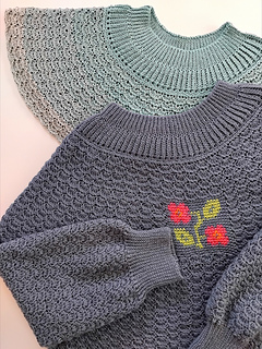 I used my 3 favorite ribbings, my favorite shell stitch with my favorite yarn together with a lovely floral mosaic. I am very satisfied with how this turned out and looking forward to applying the same recipe to create more beautiful, feminine garments.