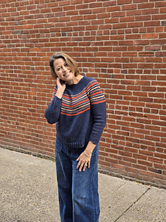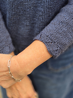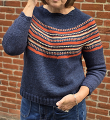 This top-down, seamless pullover begins with a sweet lace collar, that leads into a circular yoke with three-color details. The yoke, body and sleeves are all worked in the round. The sleeve cuffs can be worked with a grafted lace to match the scalloped neckline, or a simpler ribbed edge.