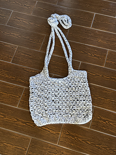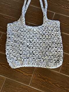 This bag is created upside down by making the straps first, folding and creating the bag portion next, and then seaming up the bottom to finish. You can adapt the strap length easily by just adding or subtracting an equal amount of stitches from the strap portions. The fresh mesh stitch design creates a mesh effect without the giant gaping holes.
