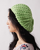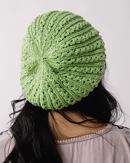 A lace beret in lightweight silky cotton yarn. Fresh Pick Beret is knitted from the bottom up in rounds with a light lace pattern.