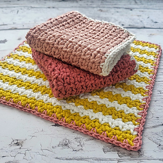 Each washcloth uses less than a 50g ball of cotton yarn. But you can use up smaller amounts of cotton yarn in your stash for two-color version. I used 2 small leftover balls of yarn to crochet the yellow and cream cloth, and it looks so pretty!
