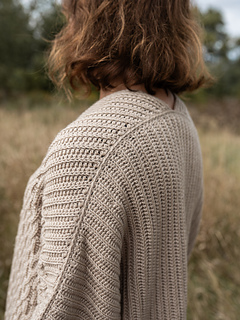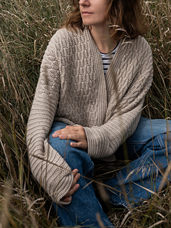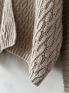 The fronts and back are then joined at the shoulder seams. Next, the sides of the cardigan are crocheted together, and the sleeves are worked in the round down to the cuffs. Both the width and length of the sleeves are fully adjustable.