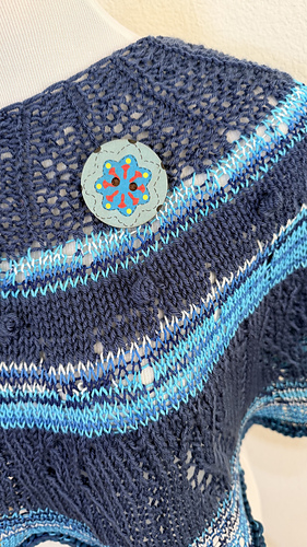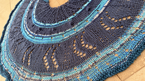 Three yarns in as many colors create the flow and the different portions of ribbing, bobbles, eyelets, lace and that final prominent edge around the bottom edge.