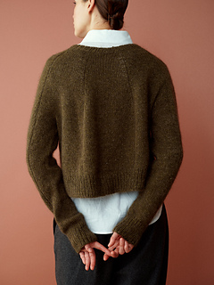 This sweater is worked from the top down, starting with a 1 x 1 Rib collar. You then begin working the 8 raglan seams and raglan increases, and the yoke ends with short rows at the back. Each raglan seam has a purl stitch at the centre, and these purl lines continue down the body and sleeves. A split hem in 1 x 1 Rib is worked with a longer back piece. The sleeves are shaped down to a ribbed cuff.