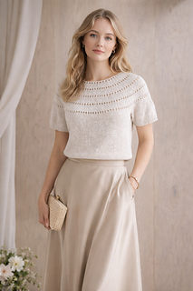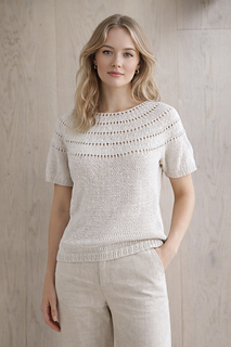 Denne sommertoppen er strikket nedenfra og opp på pinne 3 1/2 -4 mm. Bol, ermer som settes sammen til bærestykket. Frøkens sommertopp er strikket i Line fra Sandnes garn og er et behagelig og luftig garn, noe som derfor ble tenkt på da den ble laget.