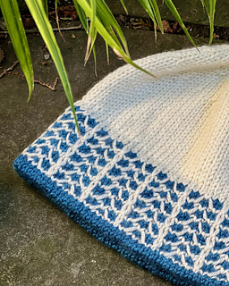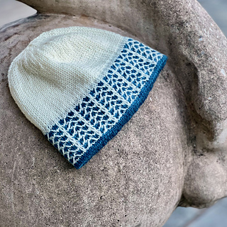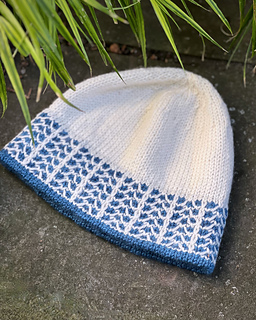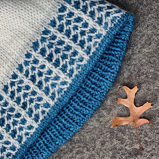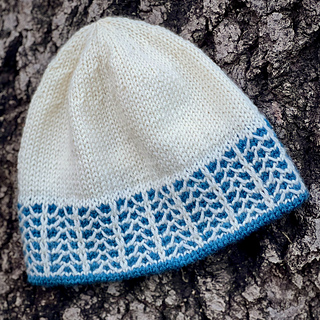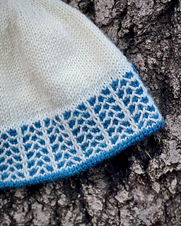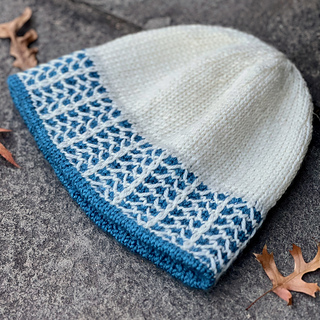 The Frostline Hat is a DK-weight beanie with a frosty slip-stitch pattern dancing around the brim. The colorwork is very easy to knit, using only one color per round. Inside, there’s a ribbed brim lining that is joined seamlessly as you go, giving you extra warmth and a soft, stretchy brim edge. The rest of the hat is worked in stockinette stitch, so you can knit to your desired height.