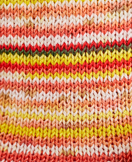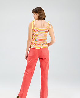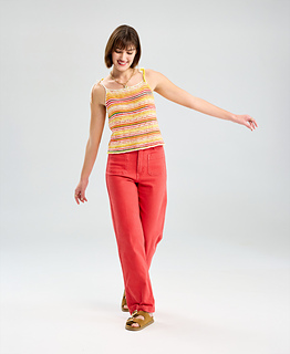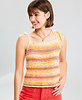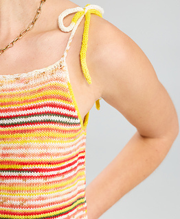 This Tank Top is worked flat from the bottom up and seamed. I-Cords create the adjustable tie straps. Do not cut yarn between stripes, carry it up loosely along the edge of work.