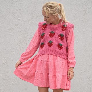 Lovely sweet and fluffy slipover with fruit. Pattern includes strawberry and lemon versions. Knit top down. Fruit is knitted in. Slightly short fit, slightly tight. Marked wide rib sleeves and neck. Ribbed slit on body.