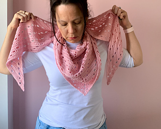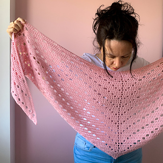 The finished sample measures 198cm in wingspan and 52cm deep after blocking. It is easy to adjust the size to your preference as you work.