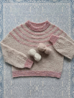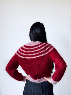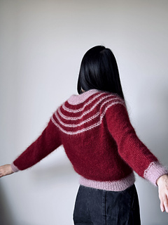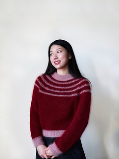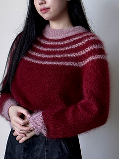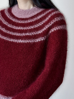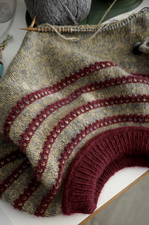 This is a seamless, top-down, round yoke pullover. Casting on at the folded neck edge, a simple slip-stitch pattern is worked down the yoke. Raglan increases are then worked at the underarms, after which the body and sleeves are split to be worked separately. The bottom hem and wrists are finished with a trim of slip-stitch pattern, and 1x1 ribbing.