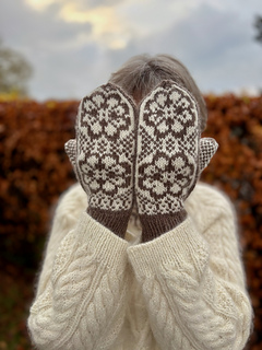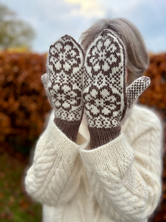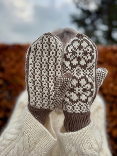 The Gaby Mittens are inspired by Norwegian mitten traditions and are adorned on the back of the hand with two eight-petal roses, as well as a palm pattern that also extends onto the upper side of the mitten. The mitten is knitted in two colors, giving you the opportunity to play with calm, subdued shades or two colors with stronger contrast. The pattern creates an elegant, Nordic look that fits perfectly into a winter wardrobe.