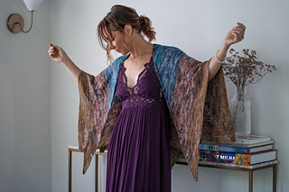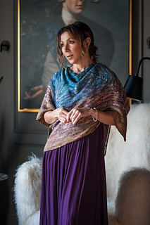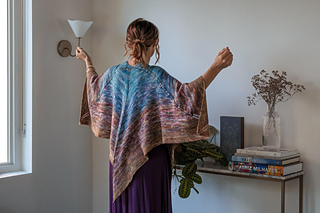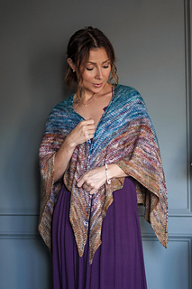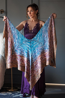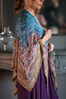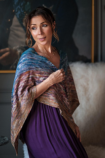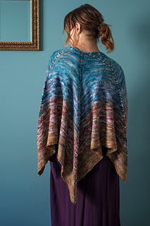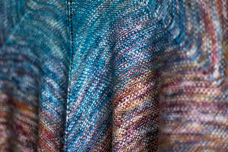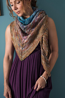When I first saw the Adventurous Hues Kit and its inspiration photo, I immediately thought of dear Bilbo Baggins, J.R.R. Tolkien’s hobbit who stoutly refused the wizard Gandalf’s initial request because adventures “make you late for dinner.” But Bilbo has a change of heart when the adventuring party leaves without him. In a gadarene rush to catch up, he proclaims that he is “going on an adventure.” I suppose most hobbits are more likely to enjoy quiet evenings at home, perhaps working yarn into something cozy. I hope this shawl captures the gentle homeyness, as well as the indomitable spirit hobbits portray in Tolkien’s stories. Linen stitch showcases the subtleties of hand-dyed yarn in a fabric that resembles weaving. If you’ve never worked linen stitch before, begin your stitching adventure with a garter tab, and work simple increases at the outer edges, center, and two additional spines to create a shape that hugs your shoulders.