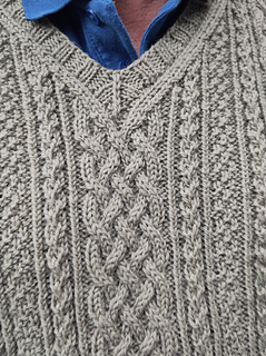 The garment is worked in the round from the bottom up. A central large cabled plait is flanked by twisted stitches, and a narrower cable runs up each side of the front and back.