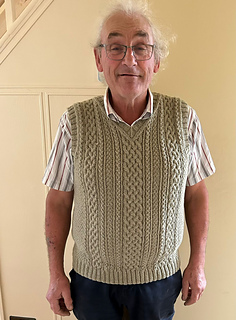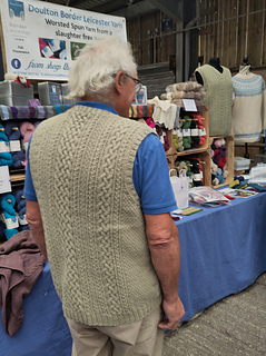I have recently become friends with the gorgeous sheep who provide Doulton Border Leicester wool, and with their neighbours the rescue hens. Border Leicesters are a rare breed with lovely bouncy wool which is excellent for cables. It’s also excellent for many other things including colourwork and has superb stitch definition. DBL yarn comes in 4ply, DK and aran weight, and I was delighted when Ellie, who owns the sheep and loves them with all her heart, asked me to design a men’s slipover/tank top/vest for Geoff, who looks after the sheep.