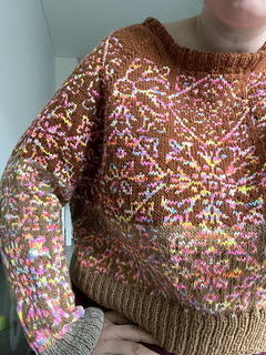 The rest of the yoke is worked in the round down to the underarms with continued raglan shaping. The body and sleeves are then separated. The body is knit in the round straight down to the hem and finished with a 2x2 rib. The sleeves are worked in the round with decreases down to the cuffs, also ending in a 2x2 rib.