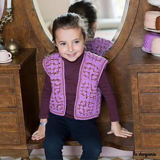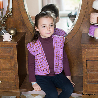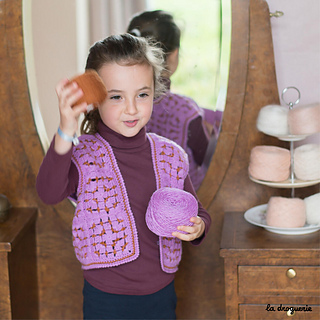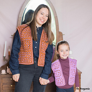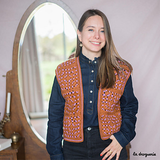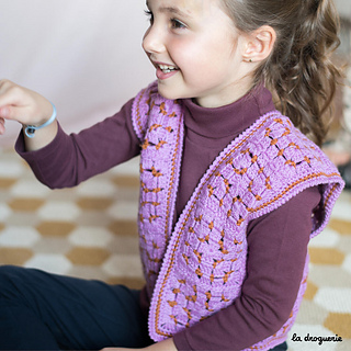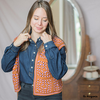 Gilet sans manches au crochet réalisé en mini.B (100% pure laine peignée). On crochète des granny que l’on assemble les uns aux autres. On termine par une bordure au crochet au point d’écrevisse.