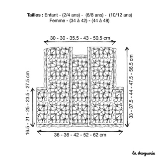 Pour choisir la taille à crocheter, référez-vous au schéma ci-contre qui indique les mesures du gilet fini.