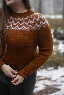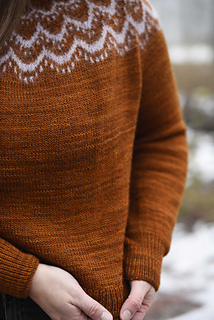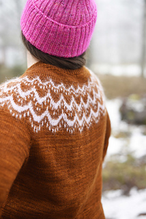 This circular yoke sweater is worked in two different types of yarn: fingering weight merino and heavy lace weight suri alpaca for the stranded colourwork.