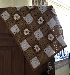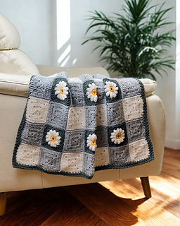 Pretty gingham baby blanket with daisy motifs. The finished measurement is approximately 75 x 75 cm. Options for 3 different colour ways are included, Silver, Rose and Denim Gingham.