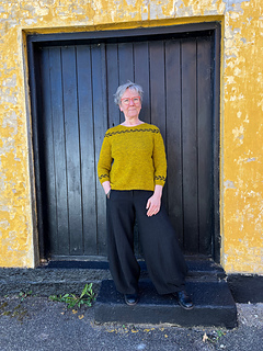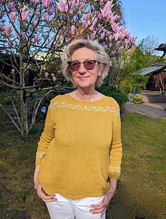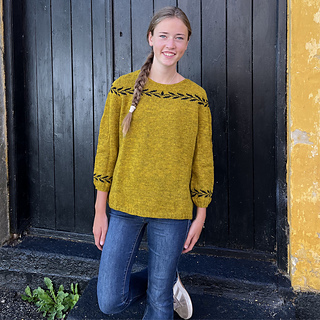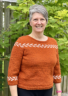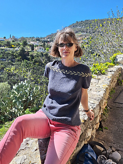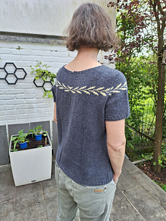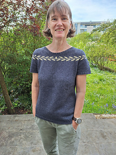 The pattern sleeve length is 7/8-length. Sigiwu chose to make a more summery short-sleeved t-shirt. Conversely, you could knit full-length sleeves, of course.