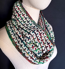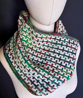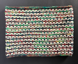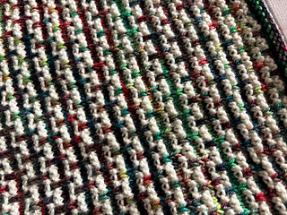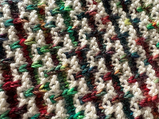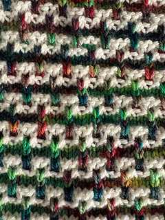 A waffled tread-like texture in Mosaic with combined Stockinette and Garter stripes. Slipped stitches - only one color at a time is worked (not stranded knitting).