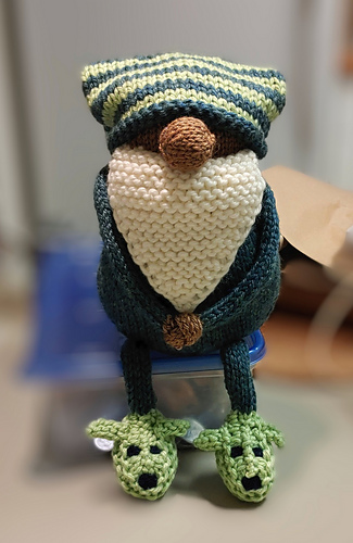 You’ll need to know how or learn to co, k, p, m1, kfb, bo, work in the round, pick up sts (only in beard), and work i-cord. Not too difficult! All directions are included with ample photos. Tiny bear is purchased and optional.