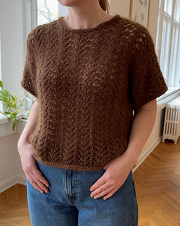 5 (6) 6 (7) 7 (8) ngl Soft Silk Mohair fra Tante Grøn (70 % mohair, 30 % silke / 25 g = 210 m) strikkes sammen med enten 3 (4) 4 (5) 5 (5) ngl Bio Blomsterfrø fra Tante Grøn (100 % økologisk bomuld / 50 g = 178 m) eller 2 (2) 2 (3) 3 (3) ngl Tweed fra Tante Grøn (50 g = 350 m / 100 % uld).